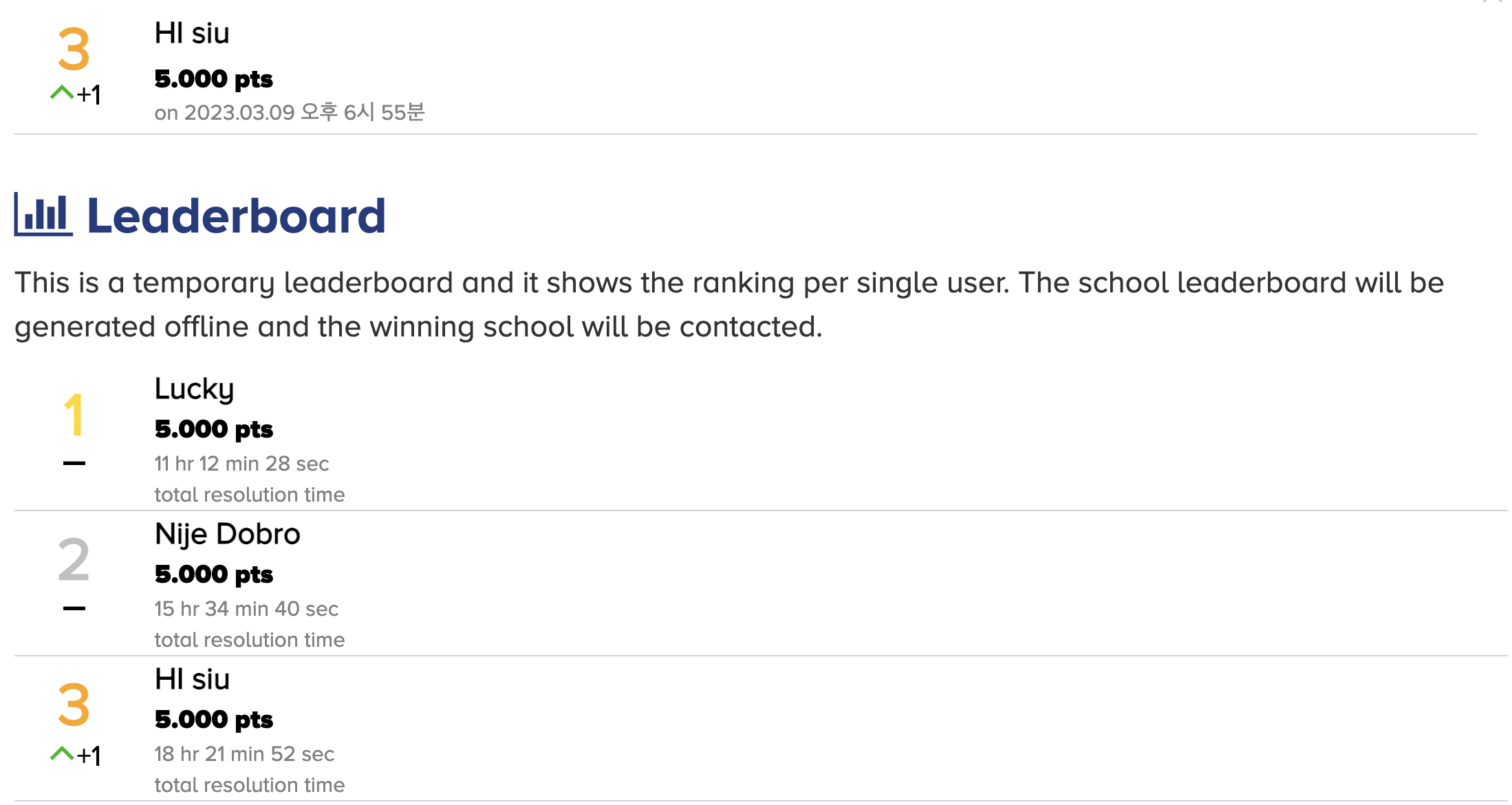 '아... 그럼 그렇지...'하고 단념을 하려는 순간, 생각해보니 히든 데이터가 맞아서 점수가 올라가야 하는데 순위라면 몰라도 변동이 전혀 없는 건 말이 안 됐다.