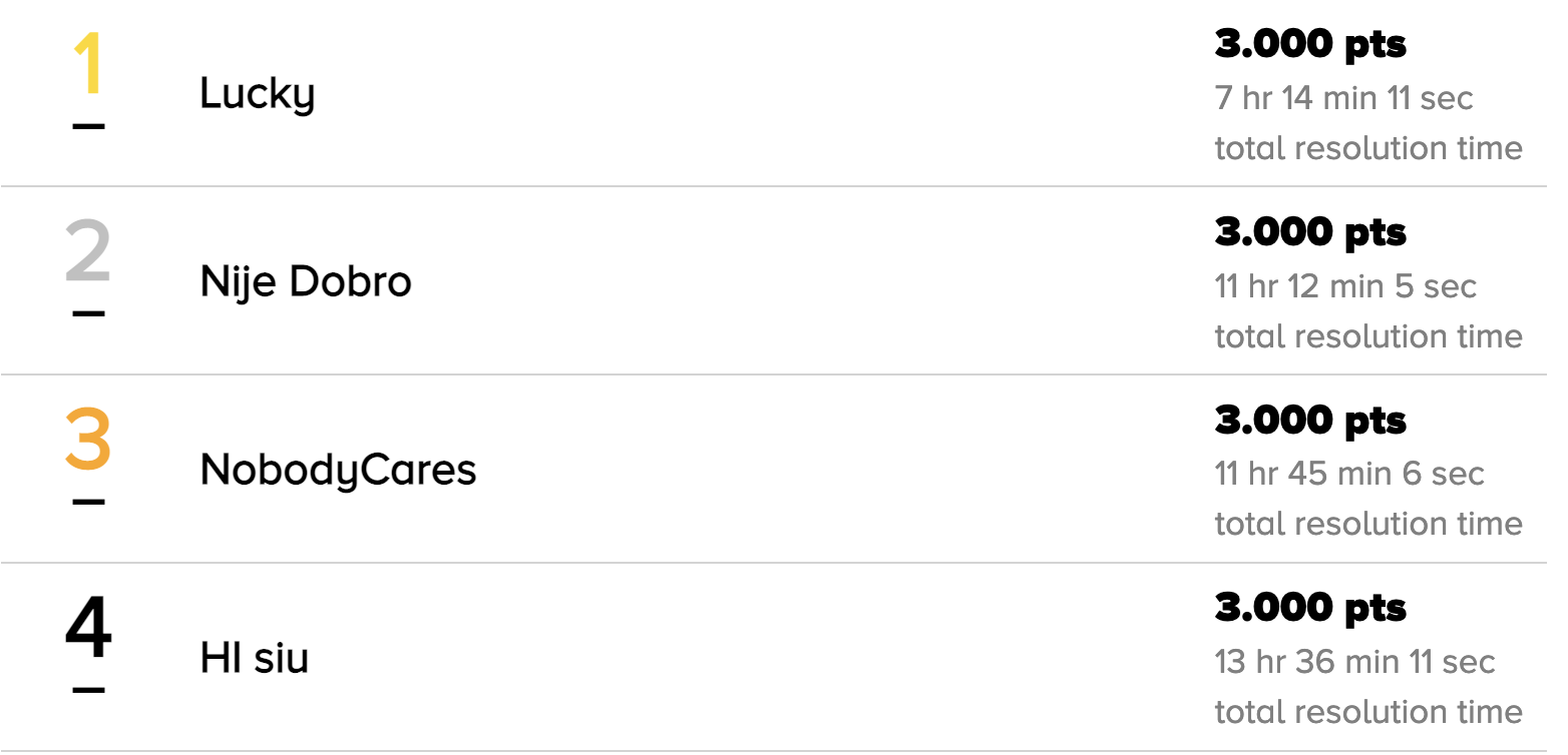 다섯 문제 올솔브긴 했으나 3등까지가 전부 올솔브 상태였기 때문에 4등이 되었다.